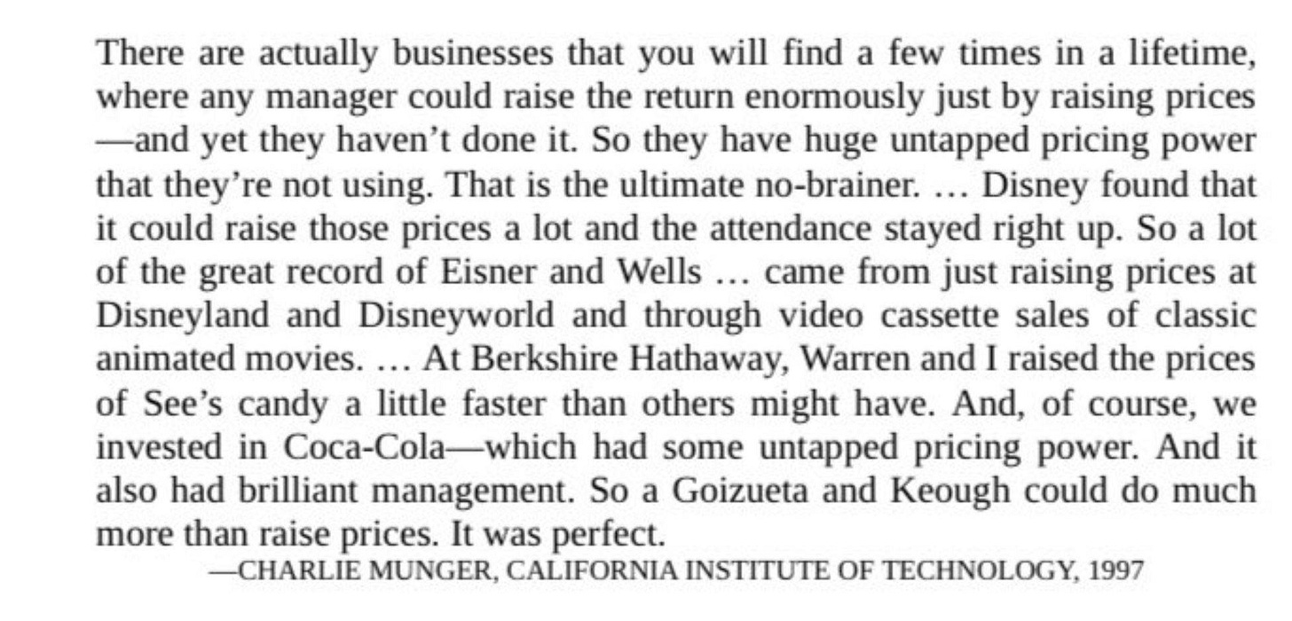Pricing will always be the fastest path to profitability. Full stop. The trick is getting it right. Before we unpack what goes into it, let me share this Charlie Munger quote on the concept of “pricing power” in business.