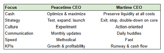 How you act and where you’re focused matter a heck of a lot more in wartime mode. If you’re in peacetime operations, you can afford to be more strategic, try things on for size, and slowly course correct. As Ben Horowitz noted, most/all business and management books are written under the pretense of a peacetime setting.