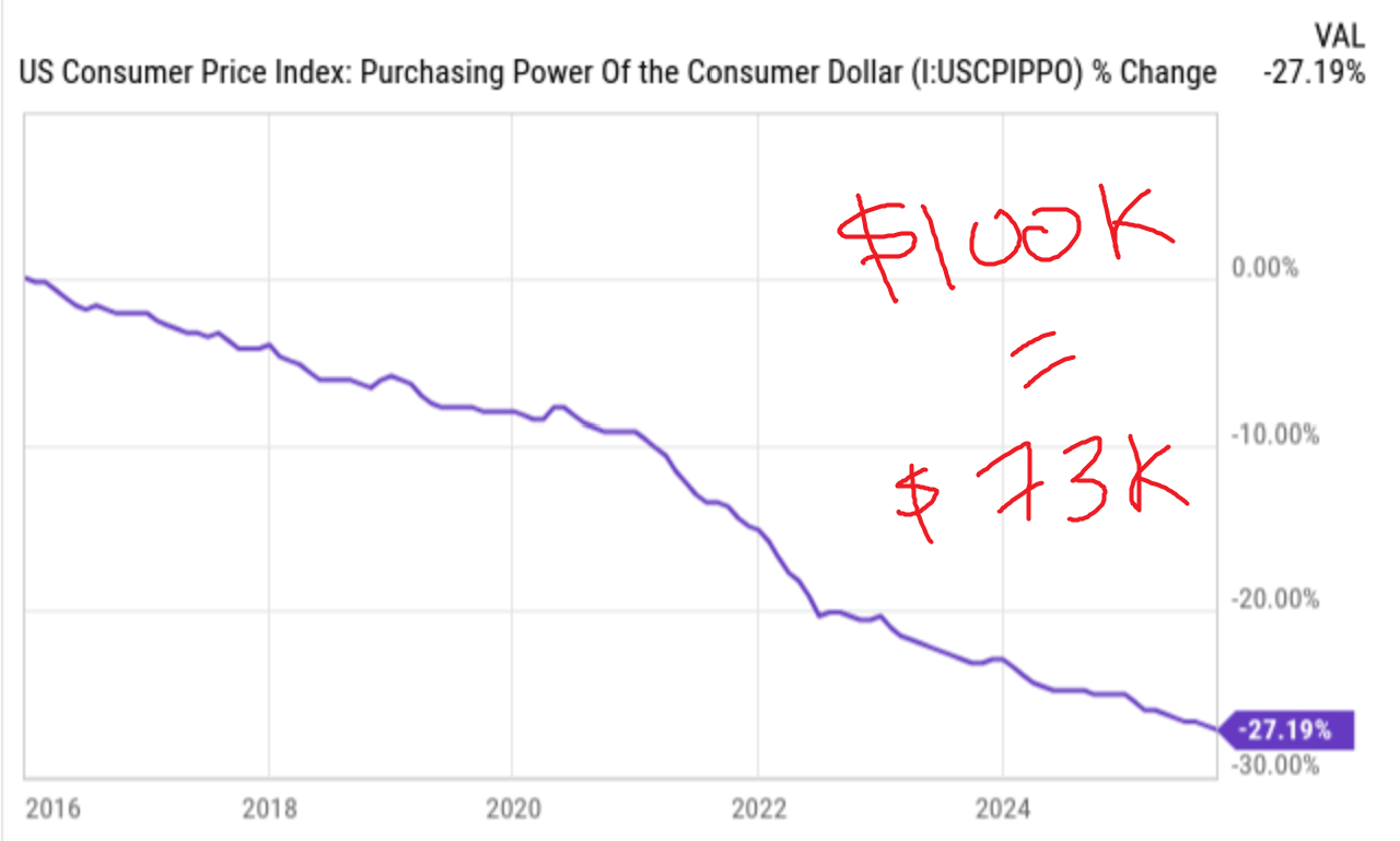 If inflation continues as it has for the past 10 years, then your $100k salary will turn into $73k. Ouch.