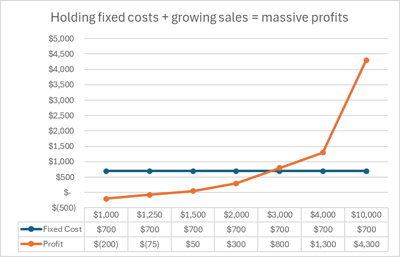 In this example, sales grew from $2,000 to $10,000 (a 5x increase), but profit grew from $300 to $4,300 (a 14x increase). That’s operating leverage and it’s powerful stuff!