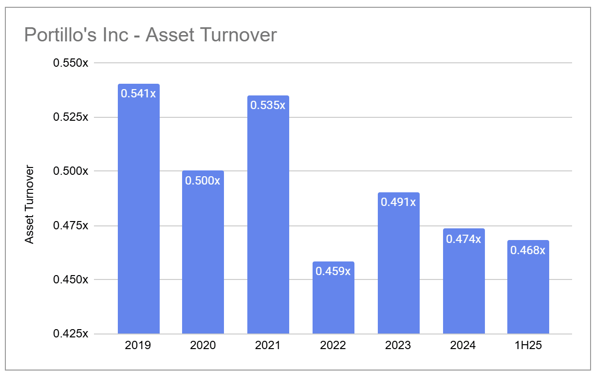From 2019 to 2025, every $1 of assets generated 13.5% less revenue. That’s a big swing. Translation? On an asset base of $1.55bn, Portillo’s should be generating revenue of $840m instead of the $730m they’re currently doing. Piling onto the problems, similar sized peers like Texas Roadhouse, Chipotle, and Cheesecake Factory each have turnover ratios >1x. Hmm...