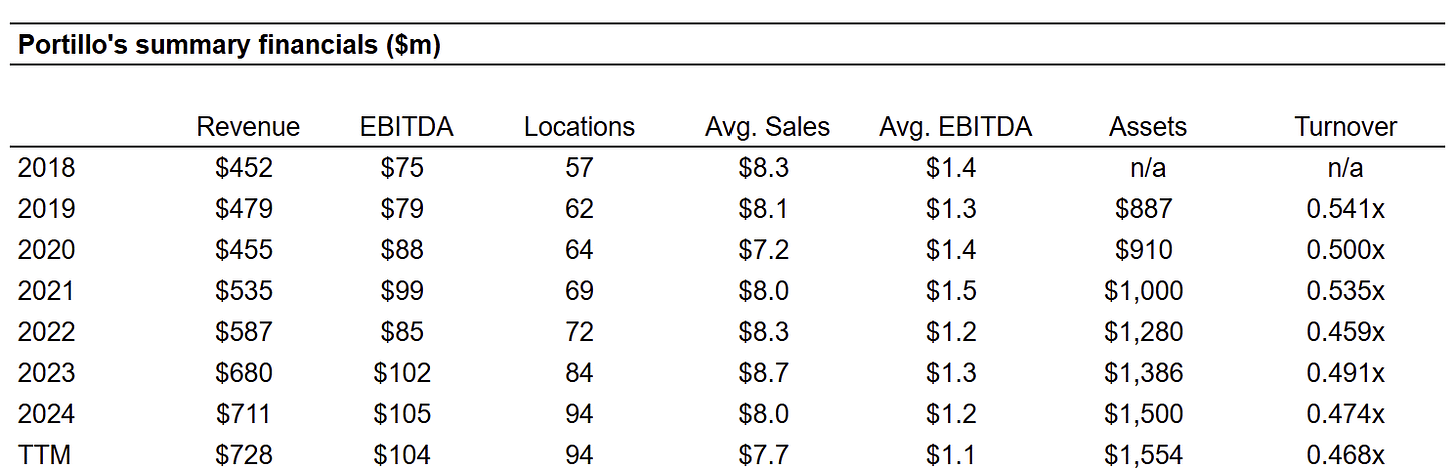 Mine is the asset turnover ratio (total sales divided by total assets), and I finally came across a great example of it in the wild: fast-casual restaurant chain, Portillo’s (case study below).