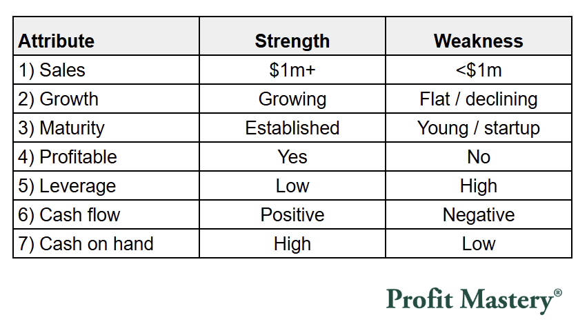 Work down this list of attributes and note which column you fall into. A simple yes or no response is sufficient, you don’t even need to dig up your financials for this.