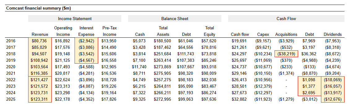 Below is a 10-year snapshot of Comcast financials from 2016-2025 with select “key events” highlighted for reference: